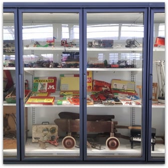 In de 60 meter lange vitrine zult u van alles tegen komen. U kunt dan denken aan radio’s en tv’s, typemachines, huishoudelijk apparatuur, een bakkerij-inventaris, stoomminiaturen, speelgoed maar ook veel oude gereedschappen en bijzondere technische objecten.