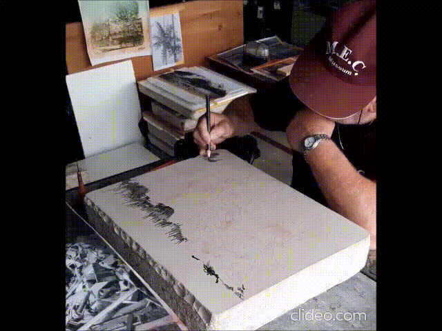 Arno Huitinga is druk bezig met het maken van de tekeningen op de stenen.